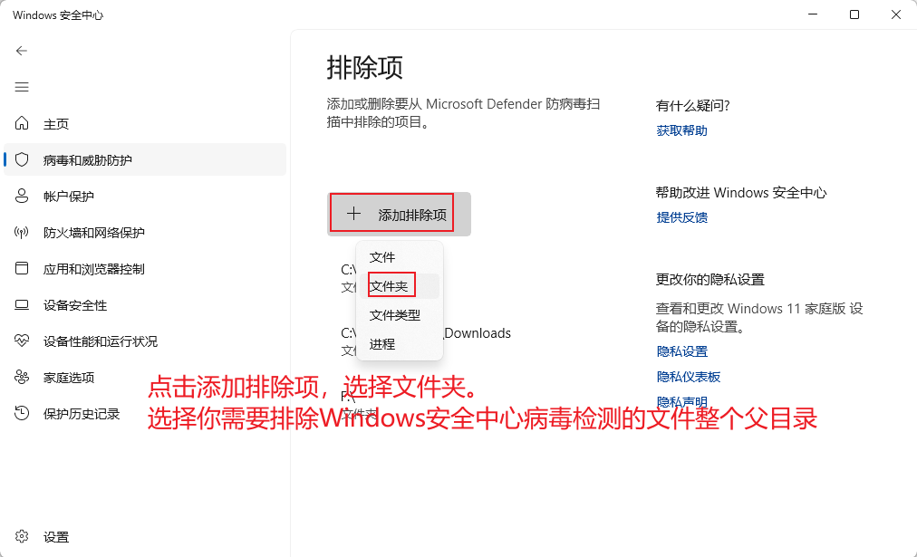 Windows安全中心添加排除项